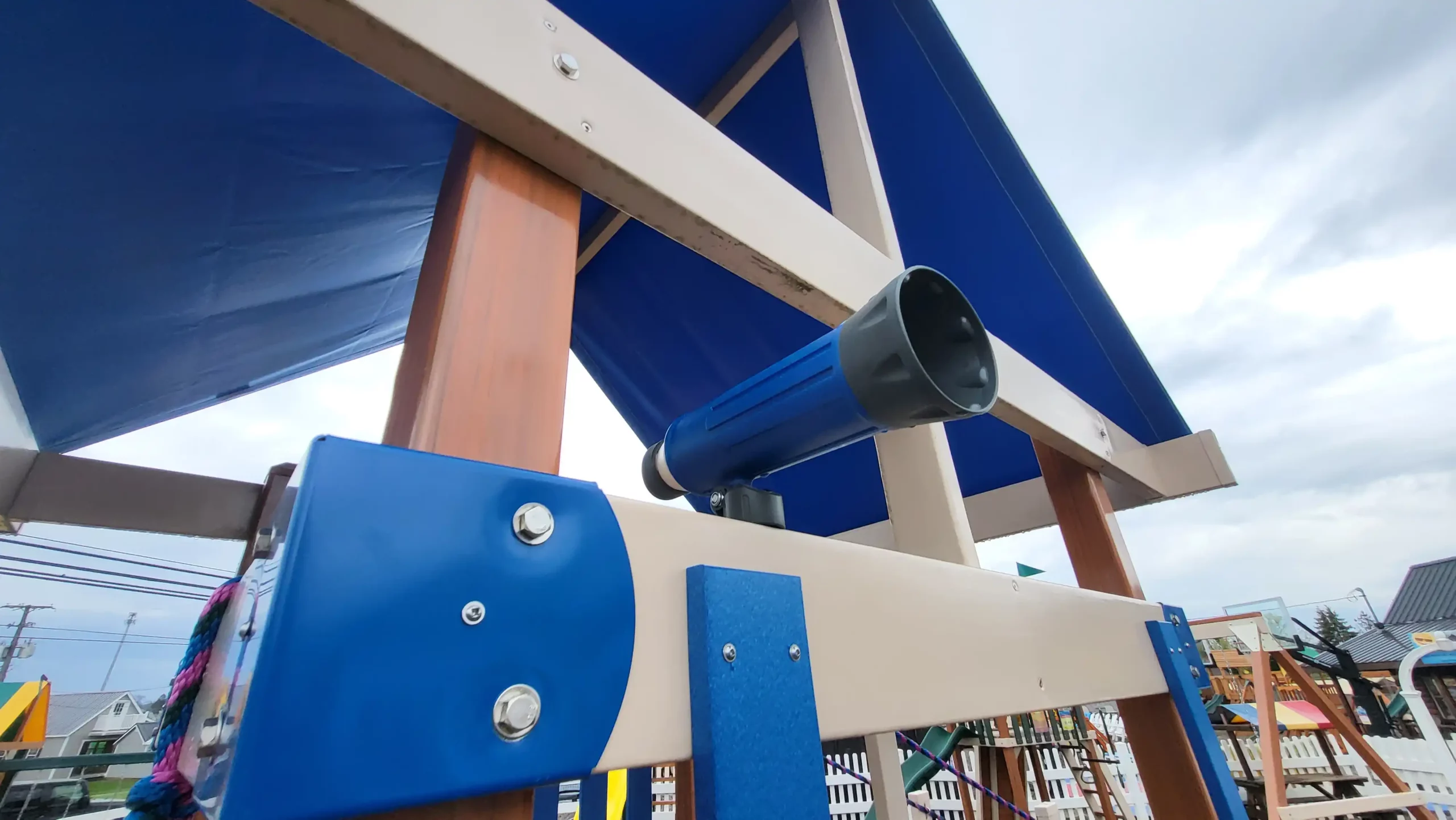 In addition to its exciting features, the Smiley Springs Swing Set also boasts a charming blue canopy roof, providing shade and shelter for young adventurers as they play. The inclusion of a bridge adds an extra element of fun and encourages imaginative play, while the poly lumber construction ensures that this backyard playground set will retain its beauty and durability for years to come.