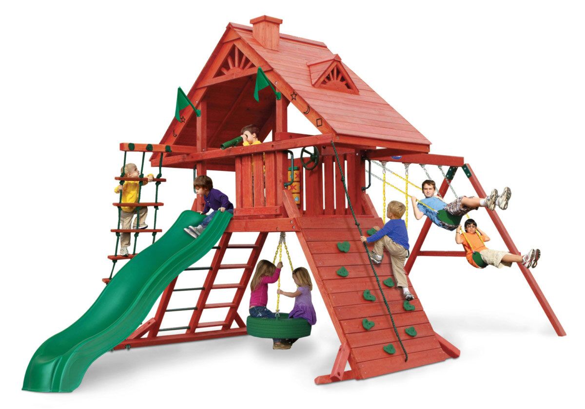 Our sets also come with a variety of features to keep your kids entertained, including a rock wall with climbing rope, deluxe rope ladder, combo safe entry ladder and metal rung ladder, 360 degree turbo tire swing with swivel, 2-belt swings, trapeze swings, tic-tac-toe panel, steering wheel, play telescope, flag kit, grab handles, and tongue & groove wood roof featuring sunbursts, dormers, and a chimney. Our sets are also available with monkey bars. Order your Kids World Play System today!