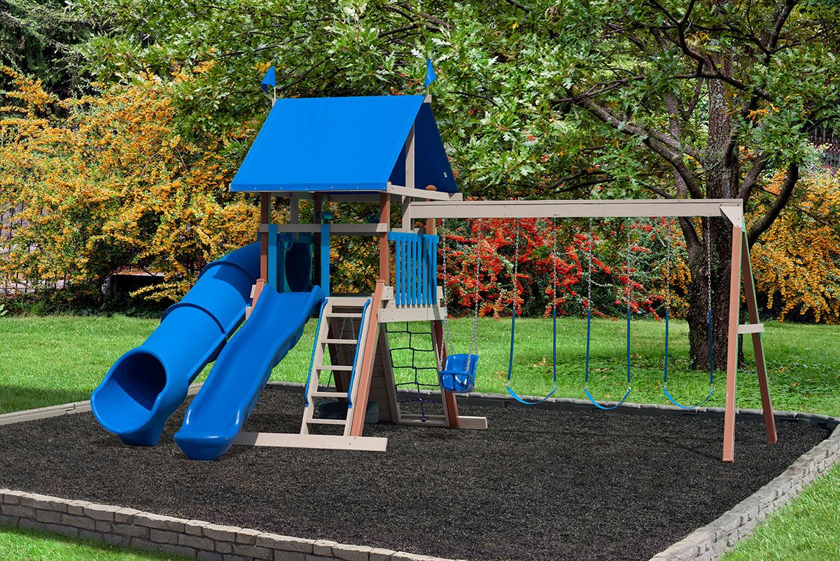 We have everything you need to make your backyard the perfect place for your children to play. Our products are made to last for years without any maintenance like our backyard swing sets. With our 5' Palace XL swing set, your children will have hours of fun. It features a single canopy, 4-position swing beam, baby swing, 3 belt swings, molded tire swing, 5' side winder slide, and 5' combo climb. It also includes steering wheel, binoculars, super scope, hand rails, and 2 flags.