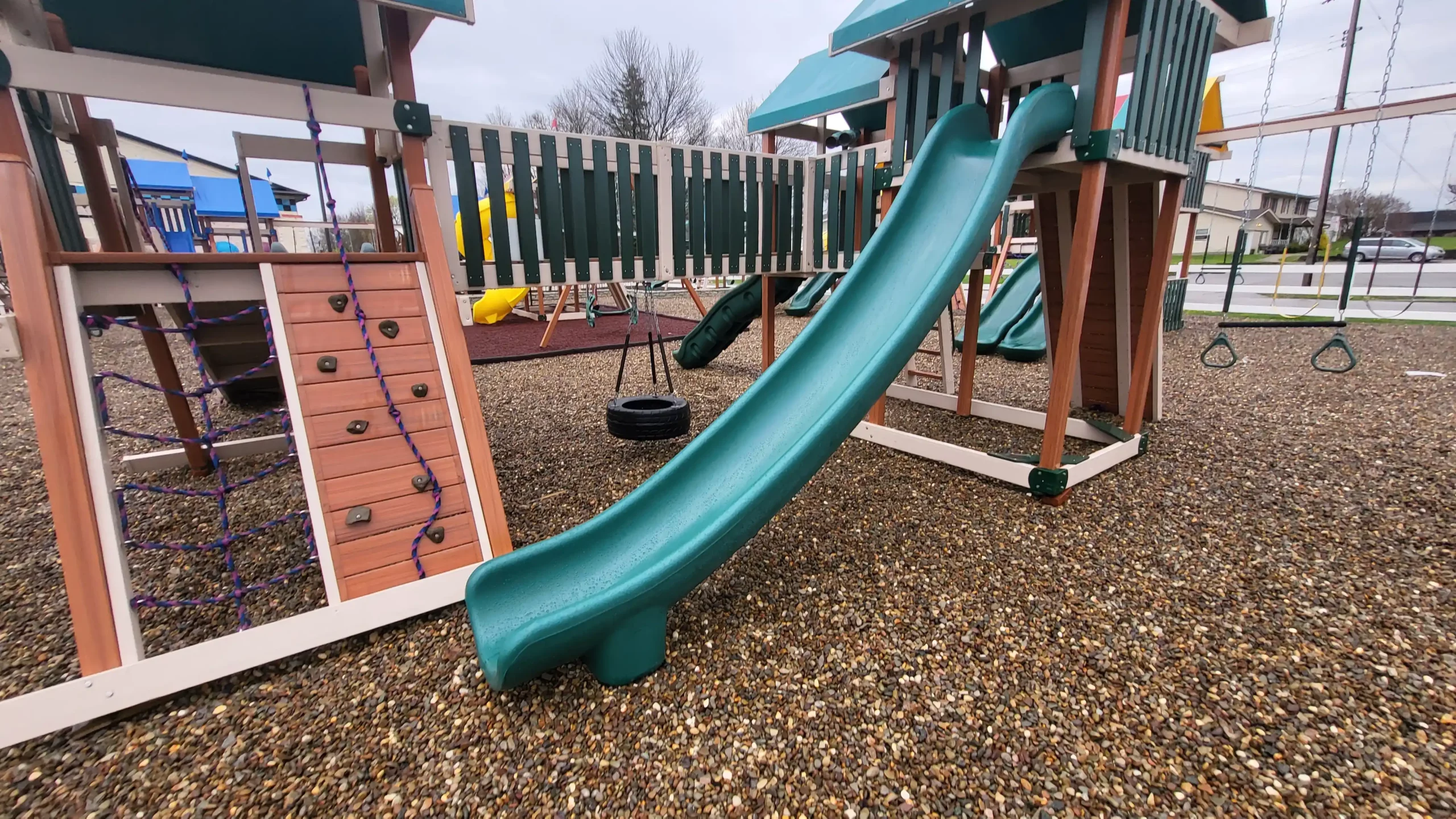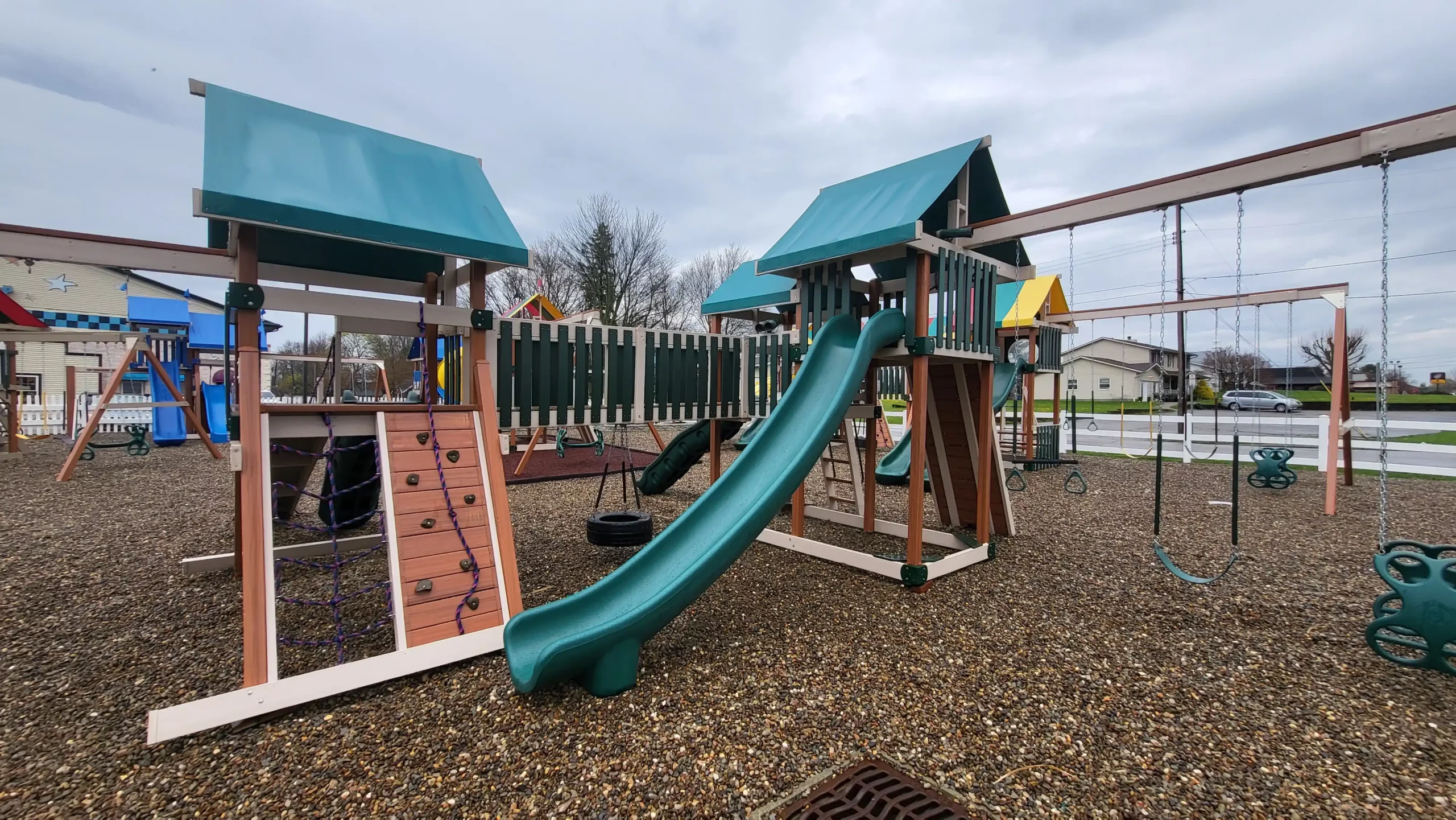 Crafted from durable poly lumber, the Paradise playground swing set is built to withstand the elements and the rigors of active play. Its sturdy framework and long-lasting materials ensure that it can stand up to years of use, providing families with a reliable and durable play solution. Plus, with green canopy roofs offering shade and shelter, children can play comfortably in any weather.