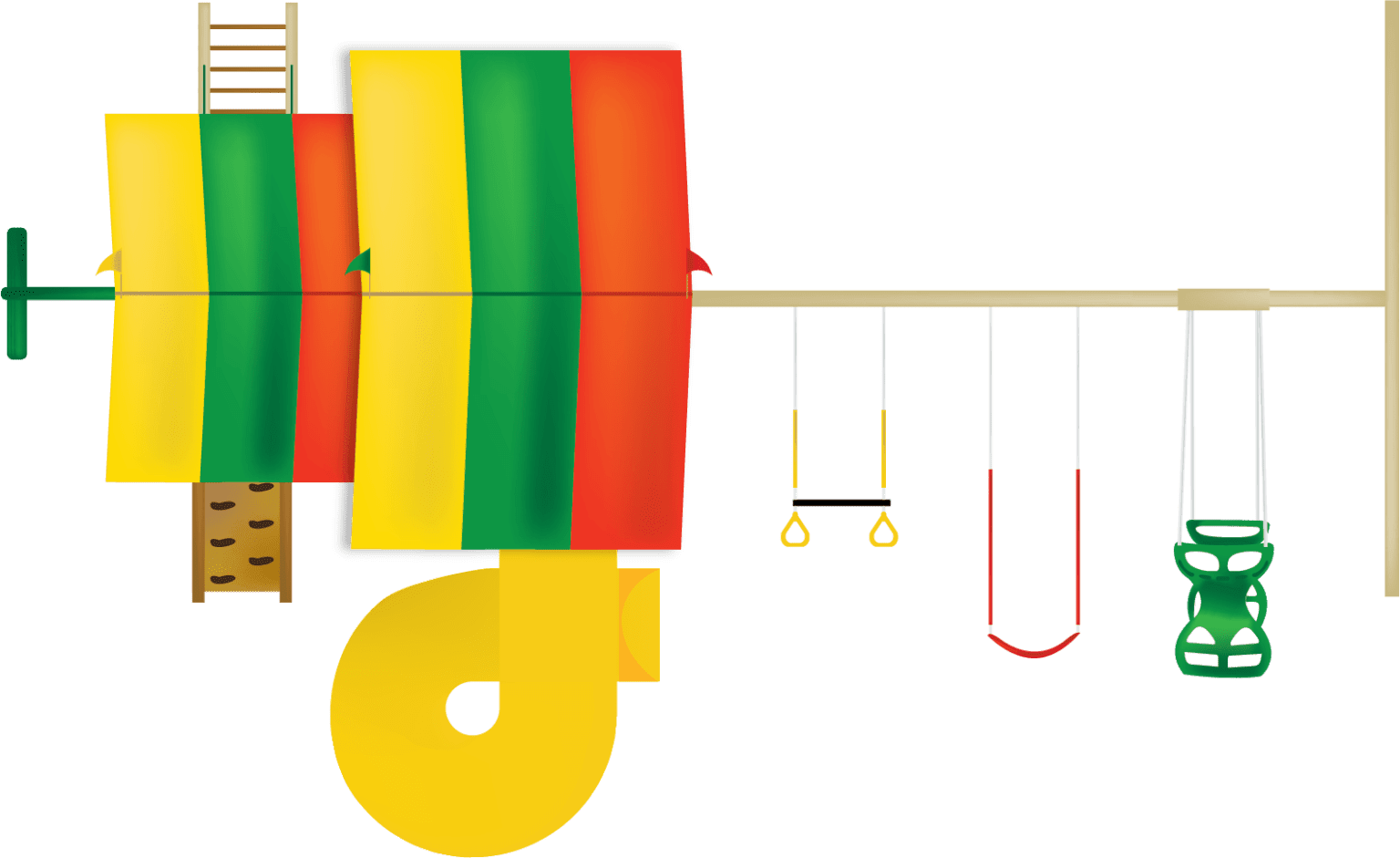 This set features a High Ride 3-position swing beam, equipped with a sling swing, trapeze with rings, and a horse glider. Each includes soft grip chains, helping prevent pinched fingers and ensuring safe swinging every time.