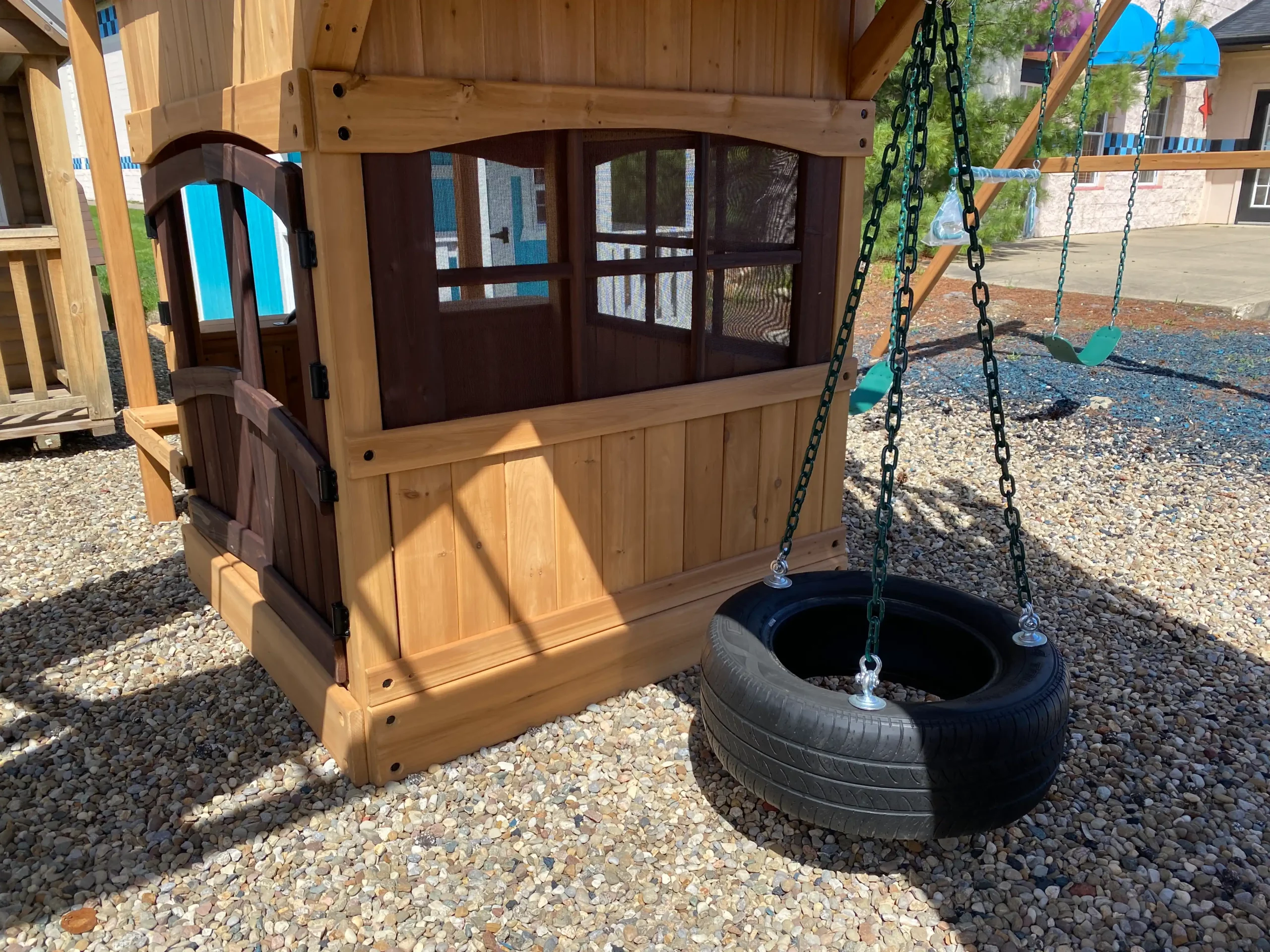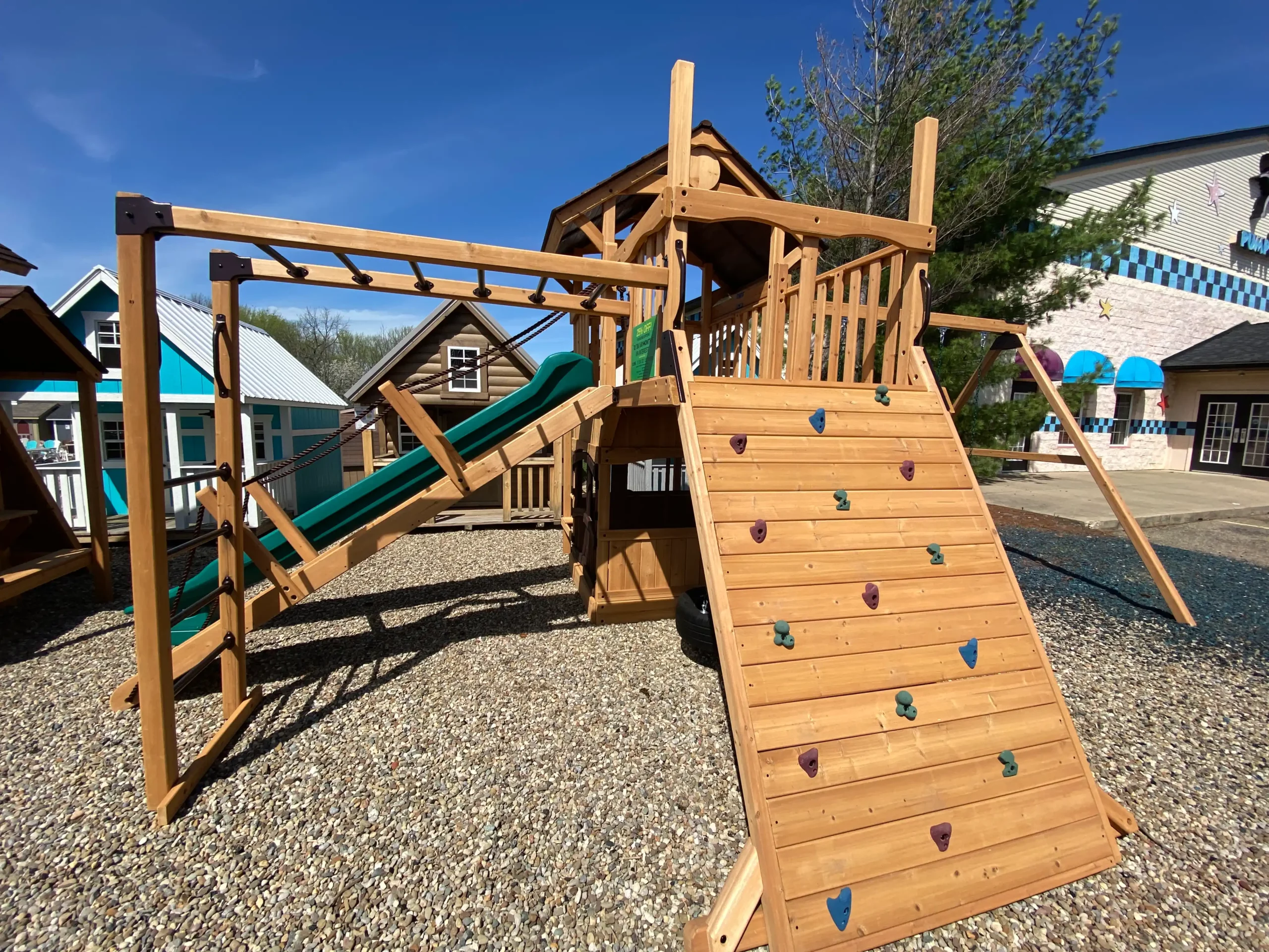 In addition to the slides, the Olympian Outlook XL4 boasts a tire slide for a unique and fun way to descend from the main platform. Kids can also enjoy swinging on two regular swings and a pull-up swing, providing plenty of opportunities for outdoor exercise and social interaction. For little climbers, this set includes a rock climber, ladder, and monkey bars—perfect for building strength and coordination while having fun. Underneath the main platform, a cabin offers a cozy space for imaginative play or a shaded area to rest and socialize.