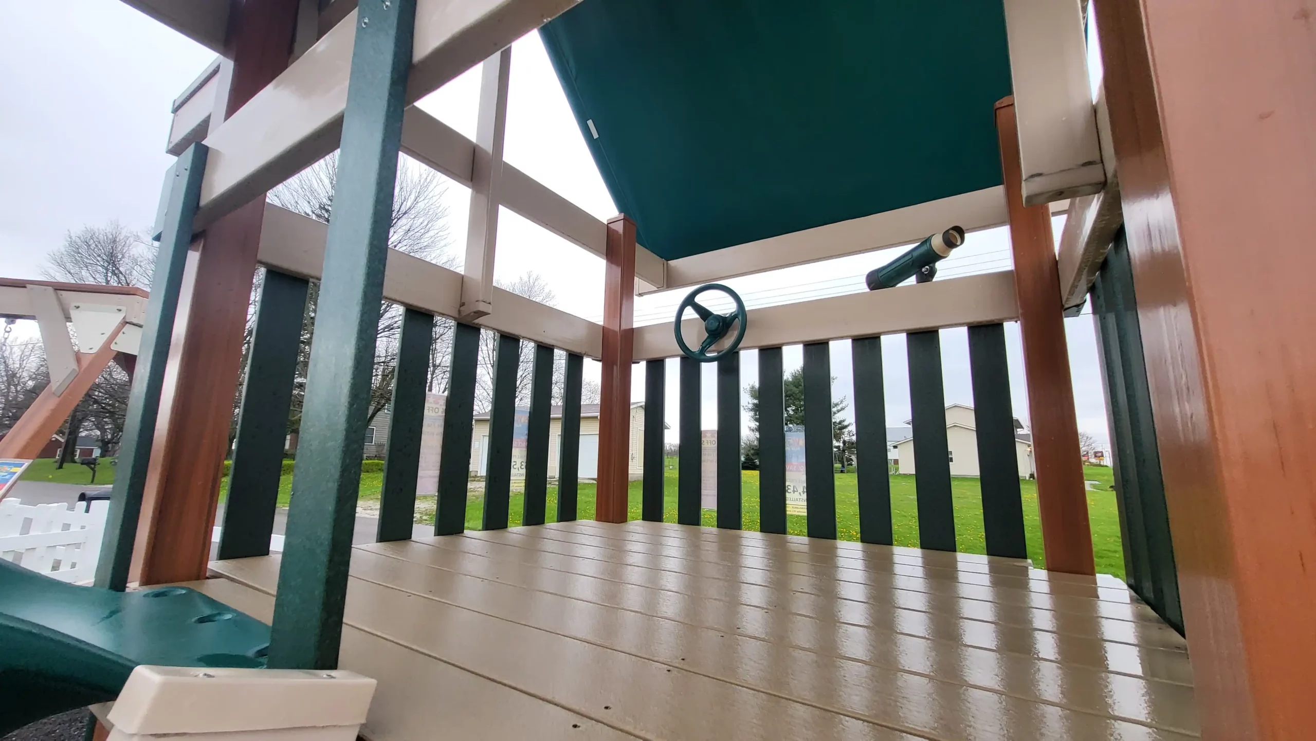 The Space Saver swing set embodies the ethos of Kids World Play Systems: quality, innovation, and boundless enjoyment. Designed with small backyards in mind, this thoughtfully crafted playset proves that size is no obstacle to excitement. The Space Saver packs a punch of entertainment into a minimal footprint, featuring a single swing, ladder, wavy slide, and a green canopy roof.