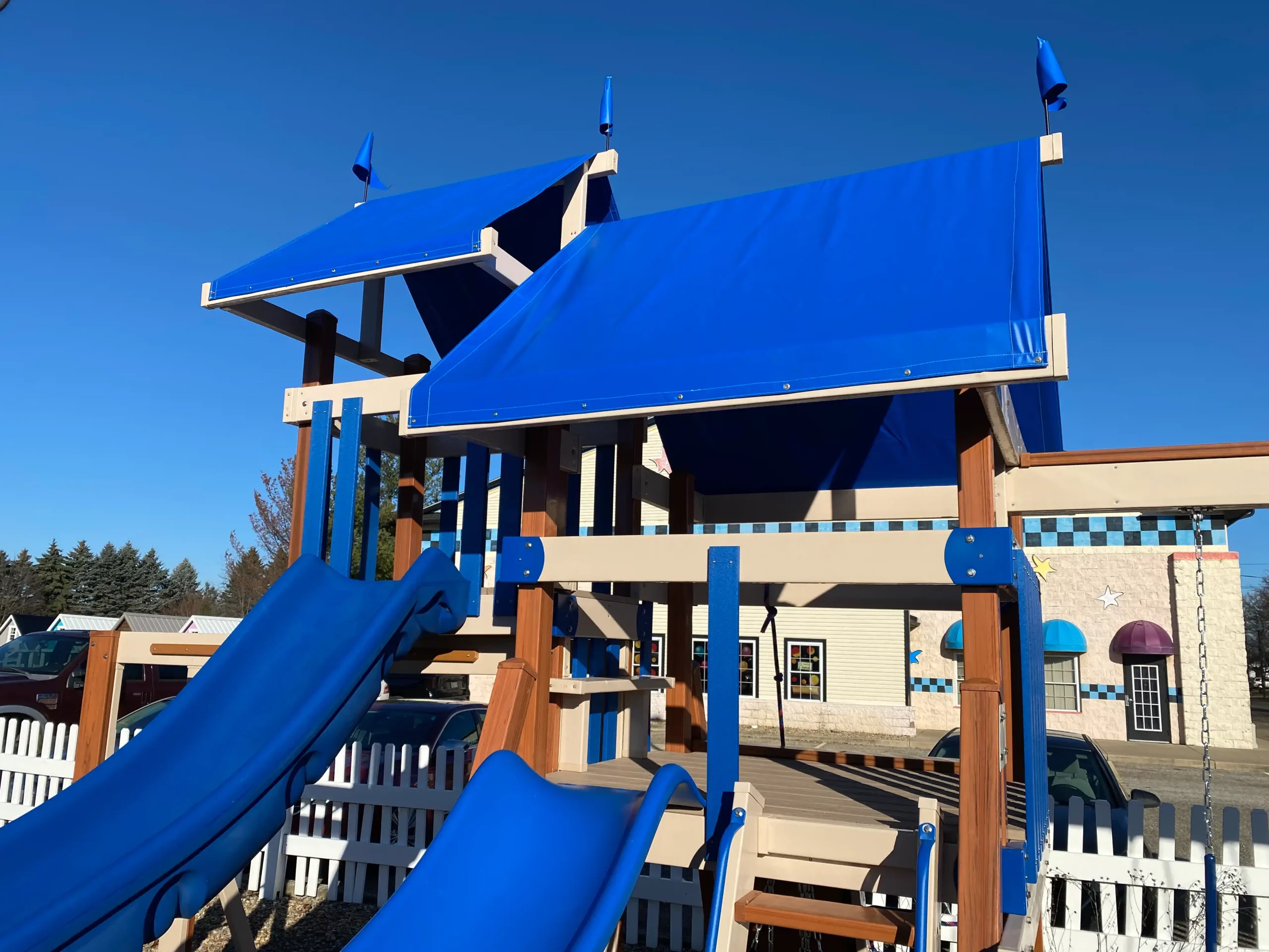 The Imagination Island Double Slide Swing Set is a sight to behold, boasting two roofs adorned with vibrant blue canopies that provide shade and protection from the sun's rays. Crafted from beautifully stained wood with eye-catching blue accents, this swing set not only offers entertainment but also adds a touch of elegance to any backyard or playground area.
