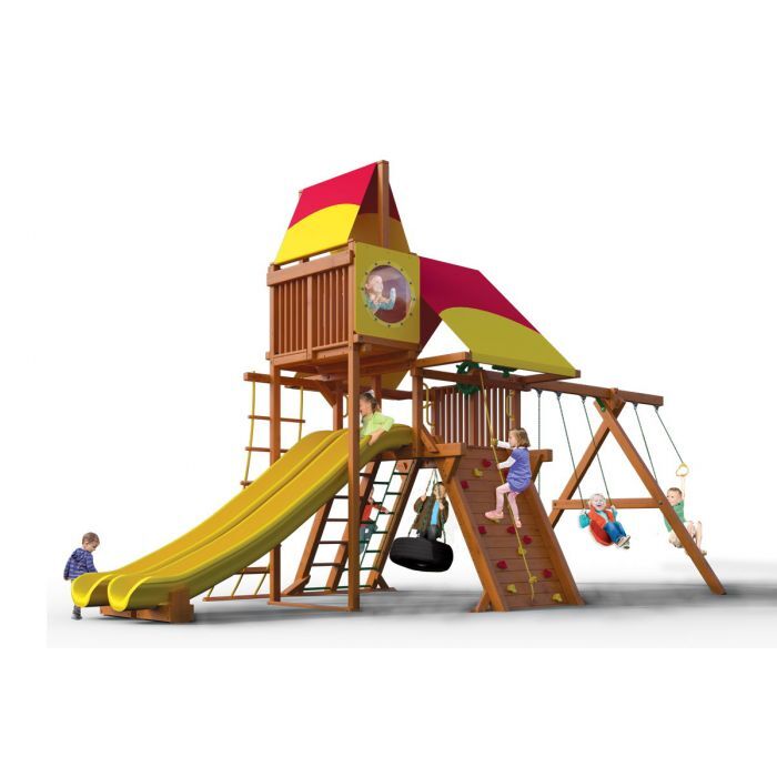Includes: Base playset, slide, swing beam, rock wall, Skybox